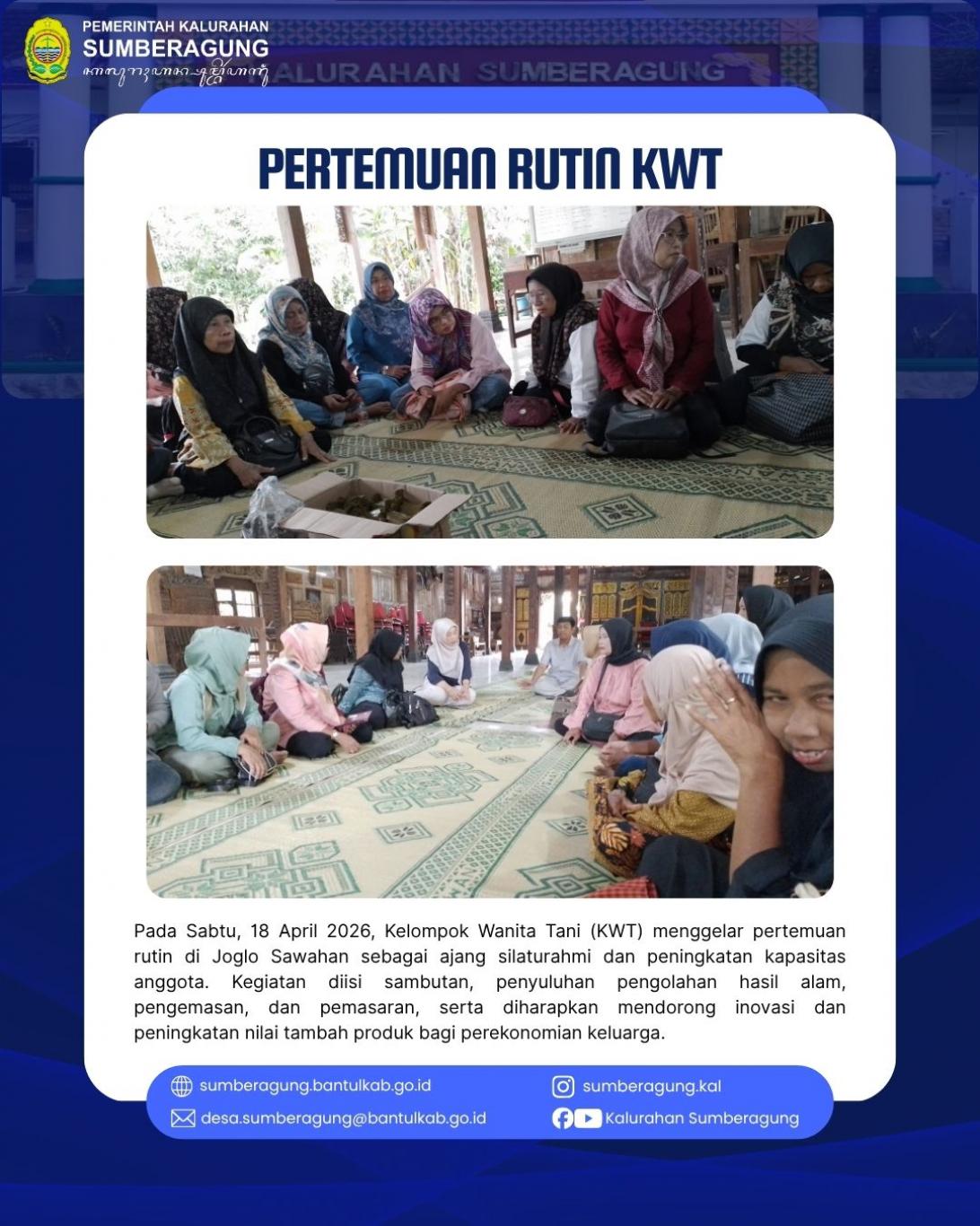 Pertemuan rutin Kelompok Wanita Tani yang dilaksanakan pada hari Sabtu, 18 April 2026, bertempat di Joglo Sawahan, berlangsung dengan tertib dan penuh antusiasme dari para peserta. Kegiatan ini menjadi wadah silaturahmi sekaligus sarana untuk meningkatkan pengetahuan dan keterampilan para anggota.